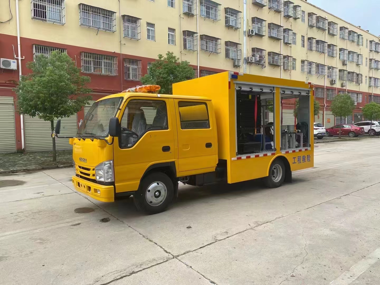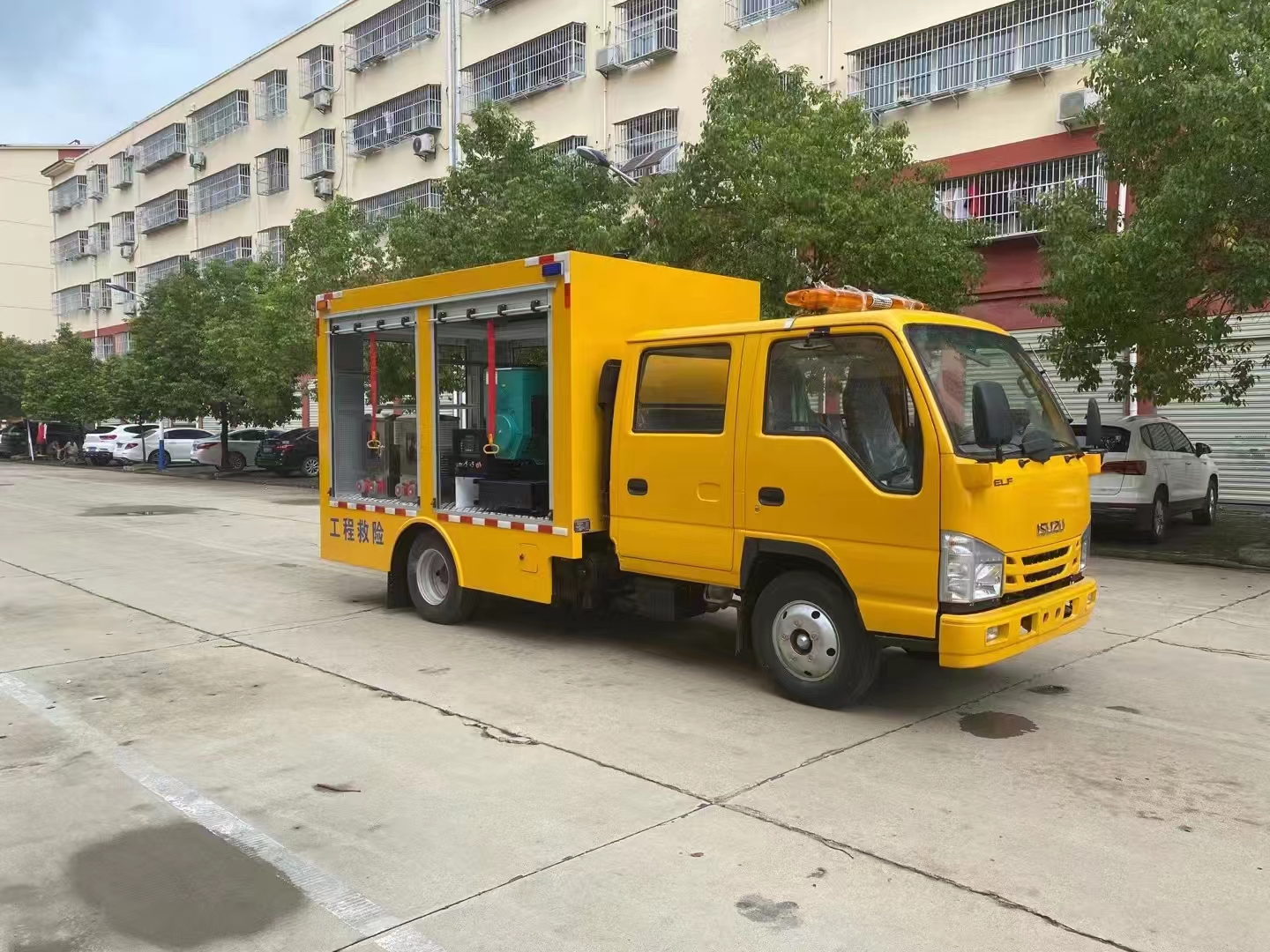 | 上裝配置 | 車箱一體式全封閉車箱車箱有隔音功能,廂體防火,阻燃,防雨,防塵,防銹,降噪,隔震,長期抗震結(jié)構(gòu),廂體外觀按照公告外觀制作,左右卷簾門,尾部是卷簾門,廂內(nèi)安裝LED作業(yè)燈,作業(yè)燈帶獨(dú)立開關(guān),底板采用花紋板。配備康明斯50KW發(fā)電機(jī)組,2臺功率22KW便攜式超輕型高速潛水泵,單臺水泵流量可達(dá)500m³/h,單泵配40米排水管(20米/根),水管直徑 DN200mm,水管材質(zhì)為滌綸長絲編織。配有升降照明燈,升降燈可通過無線和有線遙控兩種方式控制,升降燈升降高度為1.2米,可水平旋轉(zhuǎn)。帶接地樁和接地電纜線,便攜泵控制柜,潛水泵浮圈,長排警燈,倒車影像,配兩只手提式干粉滅火器2只。其余為標(biāo)配… | ||