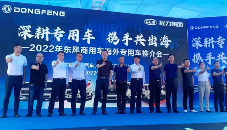 在這次線下大型東風商用車海外市場新產品推薦會上,中國東風汽車工業進出口有限公司與程力汽車集團股份有限公司聯合舉行了海外專用車戰略合作簽約儀式,雙方高層領導簽約后合影紀念。